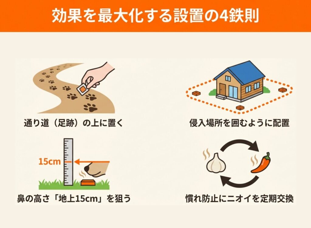 忌避剤はただ置くだけでなく、設置の仕方を工夫するだけで効果が大きく変わります。