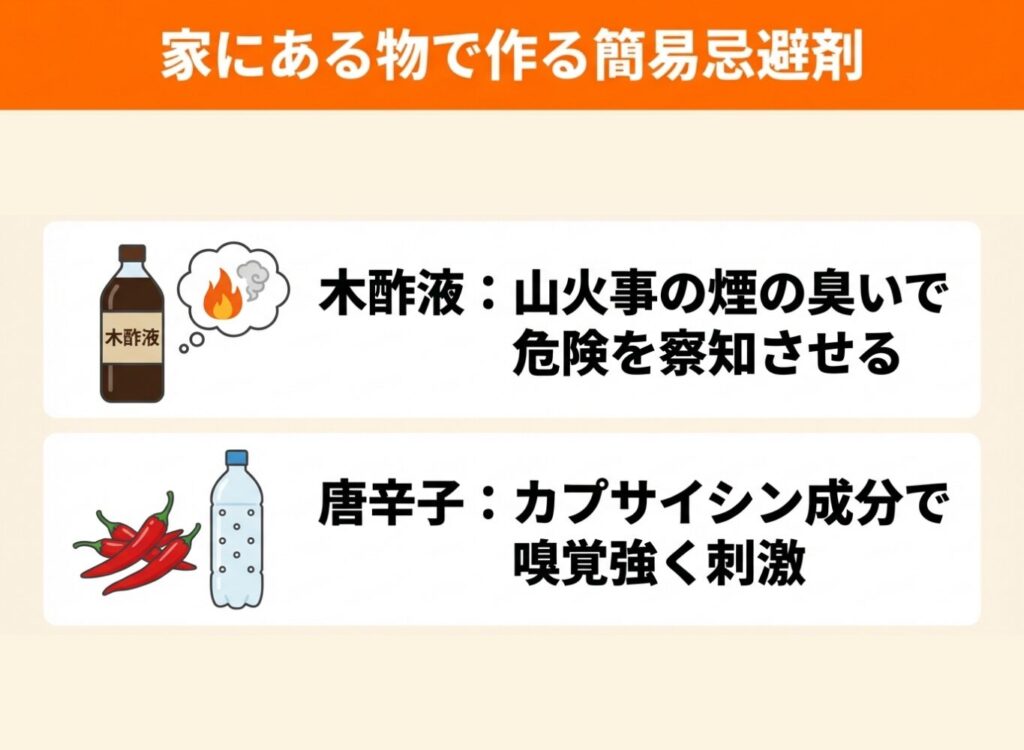さらにコストを抑えたい場合は手作りの木酢液スプレーや唐辛子忌避剤も選択肢に入りますが、効果の安定性では市販品に及ばない点を理解しておいてください。