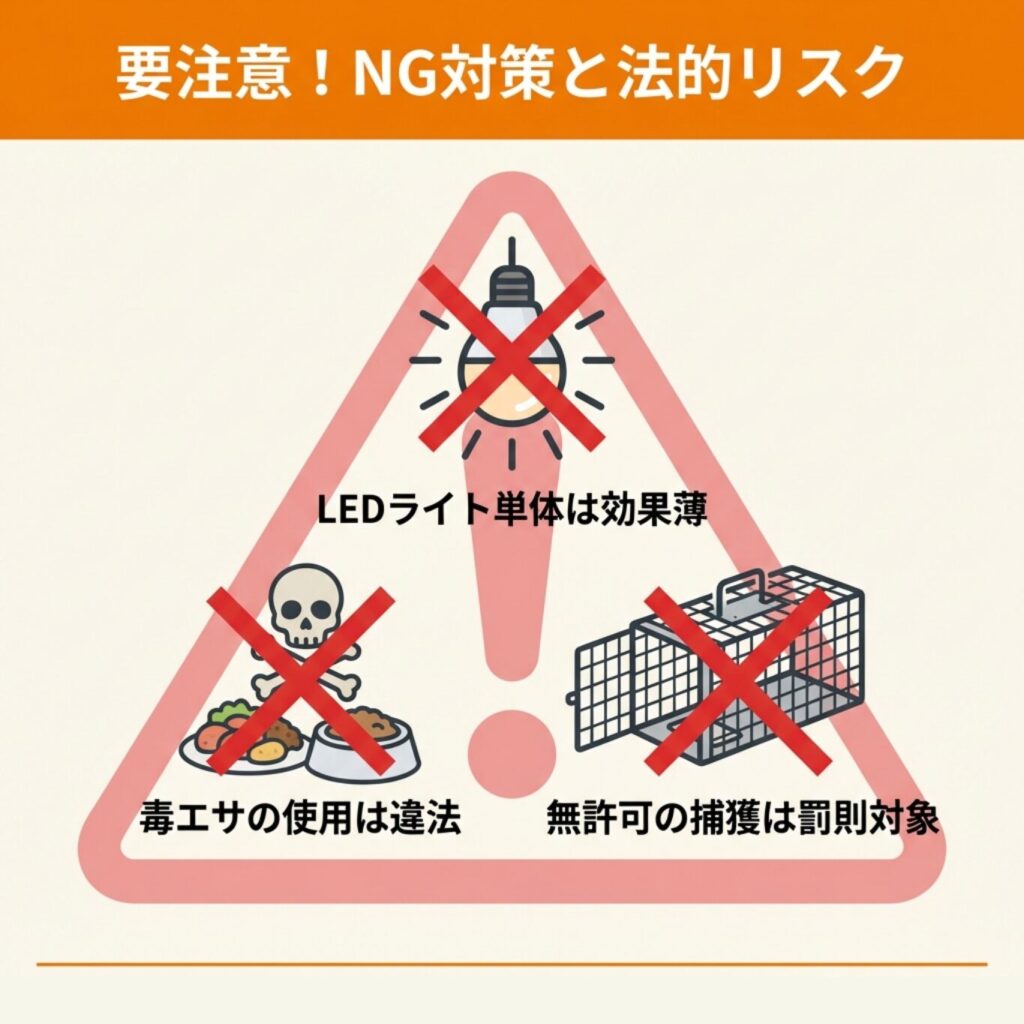 ハクビシン対策グッズの中には、効果が確認されていないものや、使うと法律に違反するものがあります。