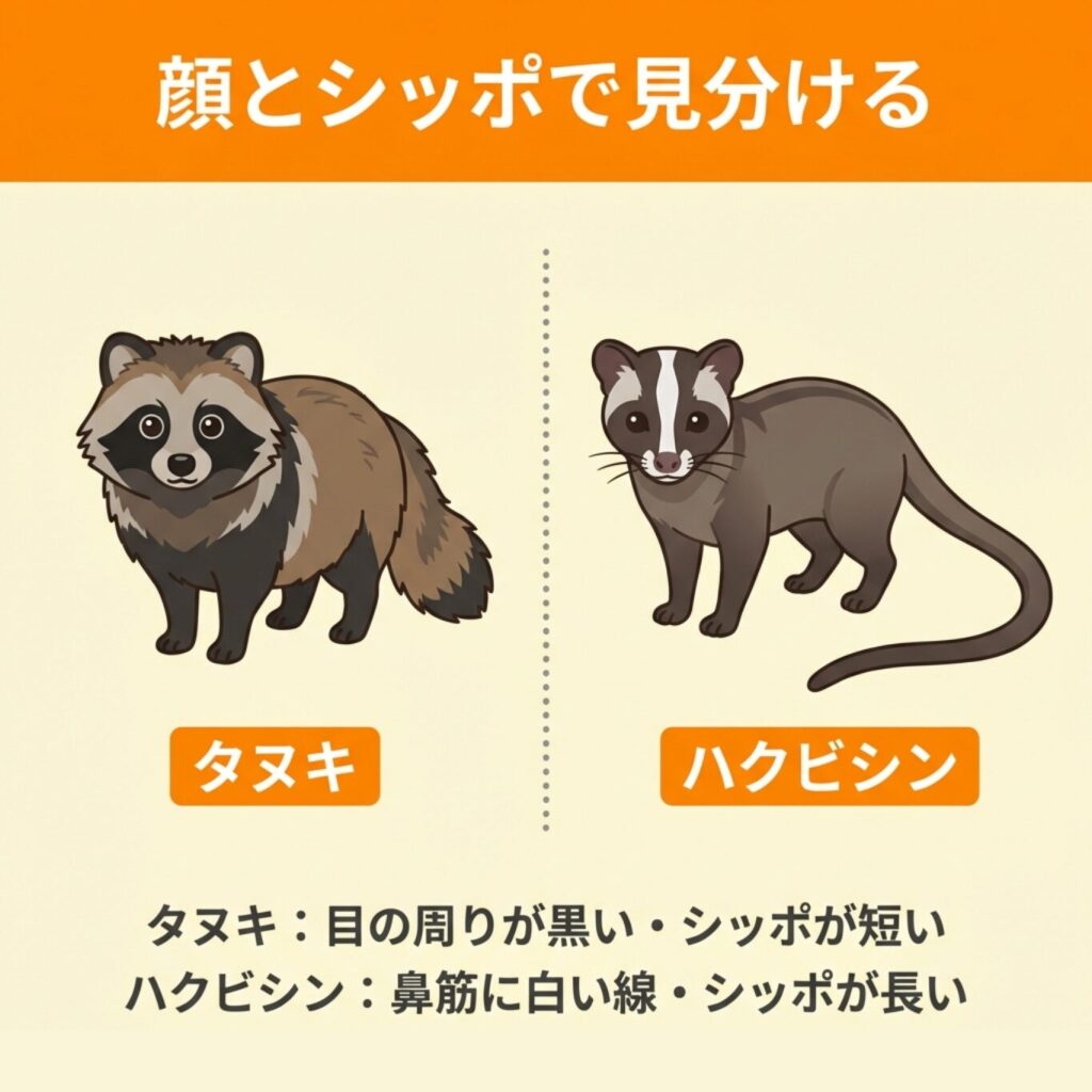 しかし、分類上はタヌキがイヌ科、ハクビシンがジャコウネコ科とまったく異なるグループに属しており、よく観察すれば見た目にも明確な違いがあります。
