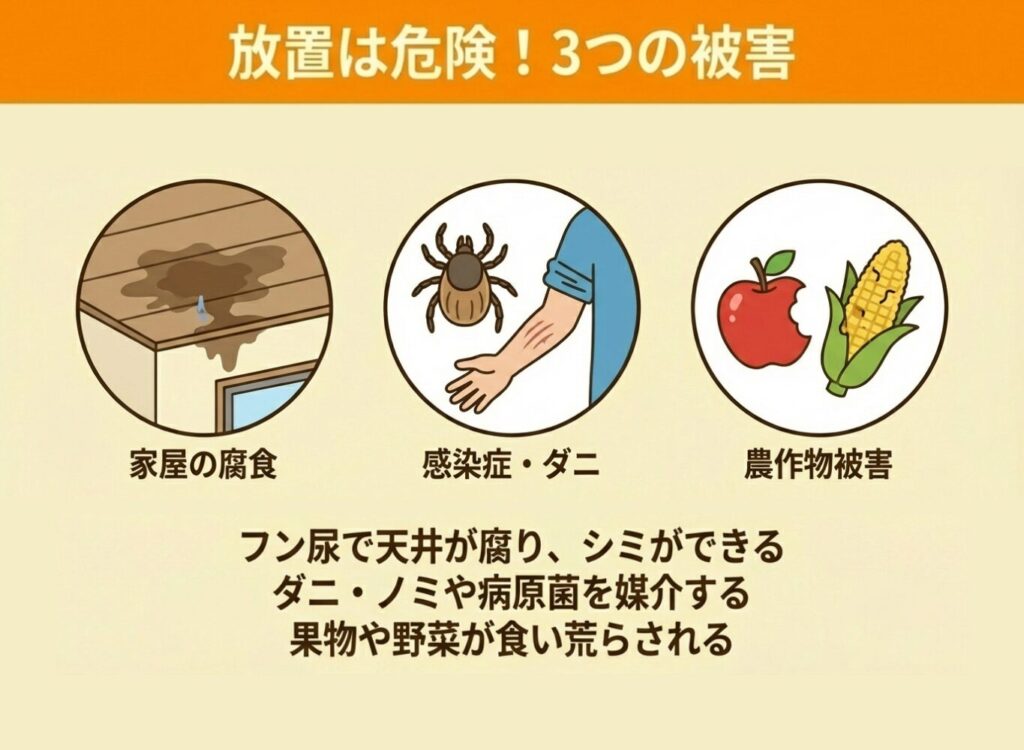 どちらの動物も家屋や農作物に被害をもたらす可能性があるため、エサを放置しない、侵入口を塞ぐなどの予防対策が重要です。