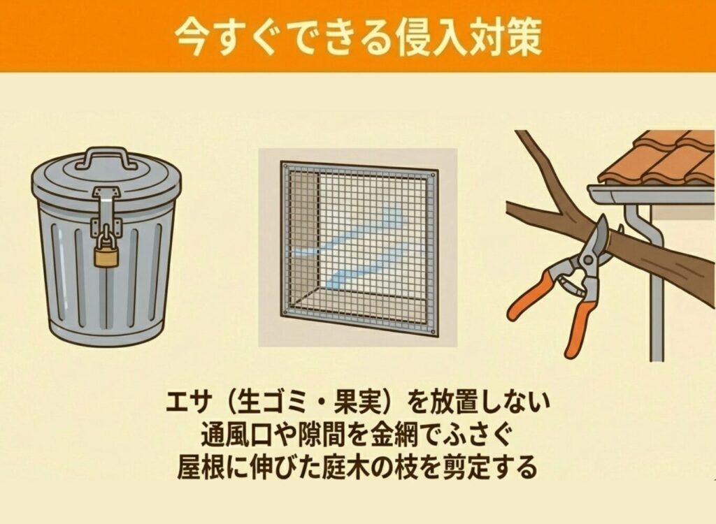 エサとなるものをなくすことで、動物が住み着くリスクを減らせます。