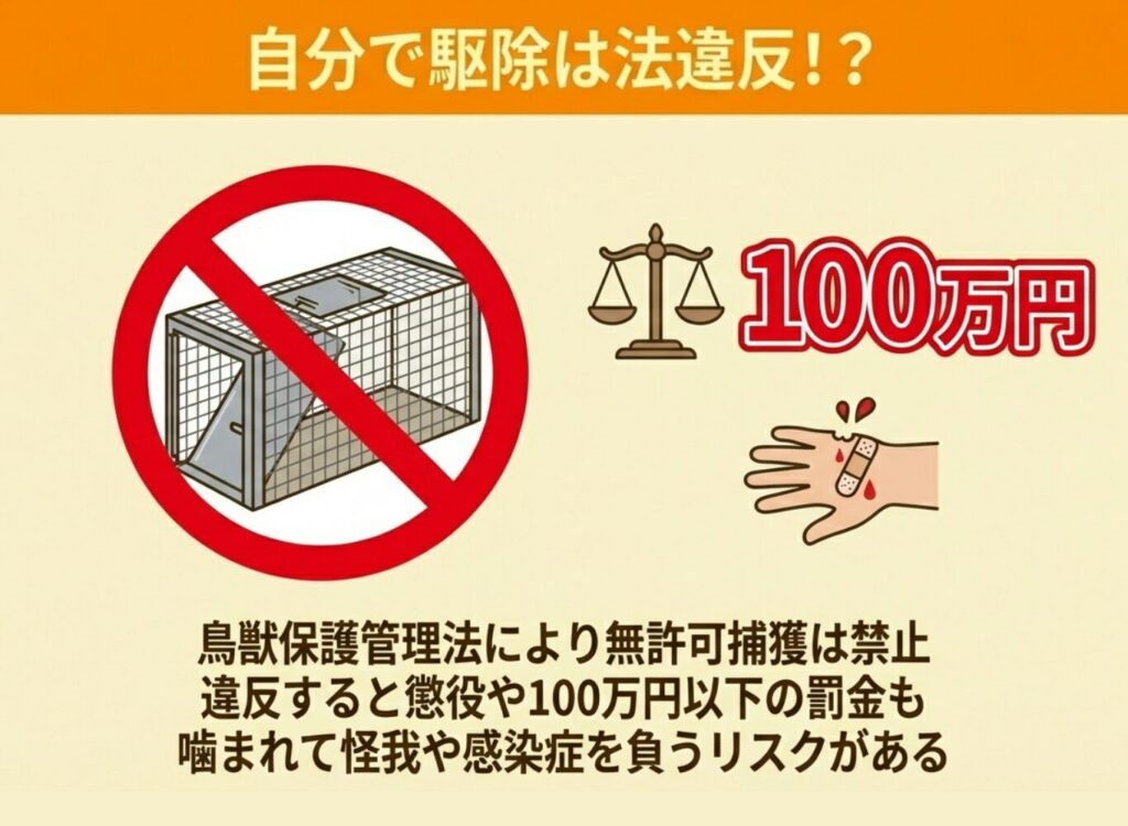 無許可での捕獲・駆除は法律違反となり、罰則の対象になります。