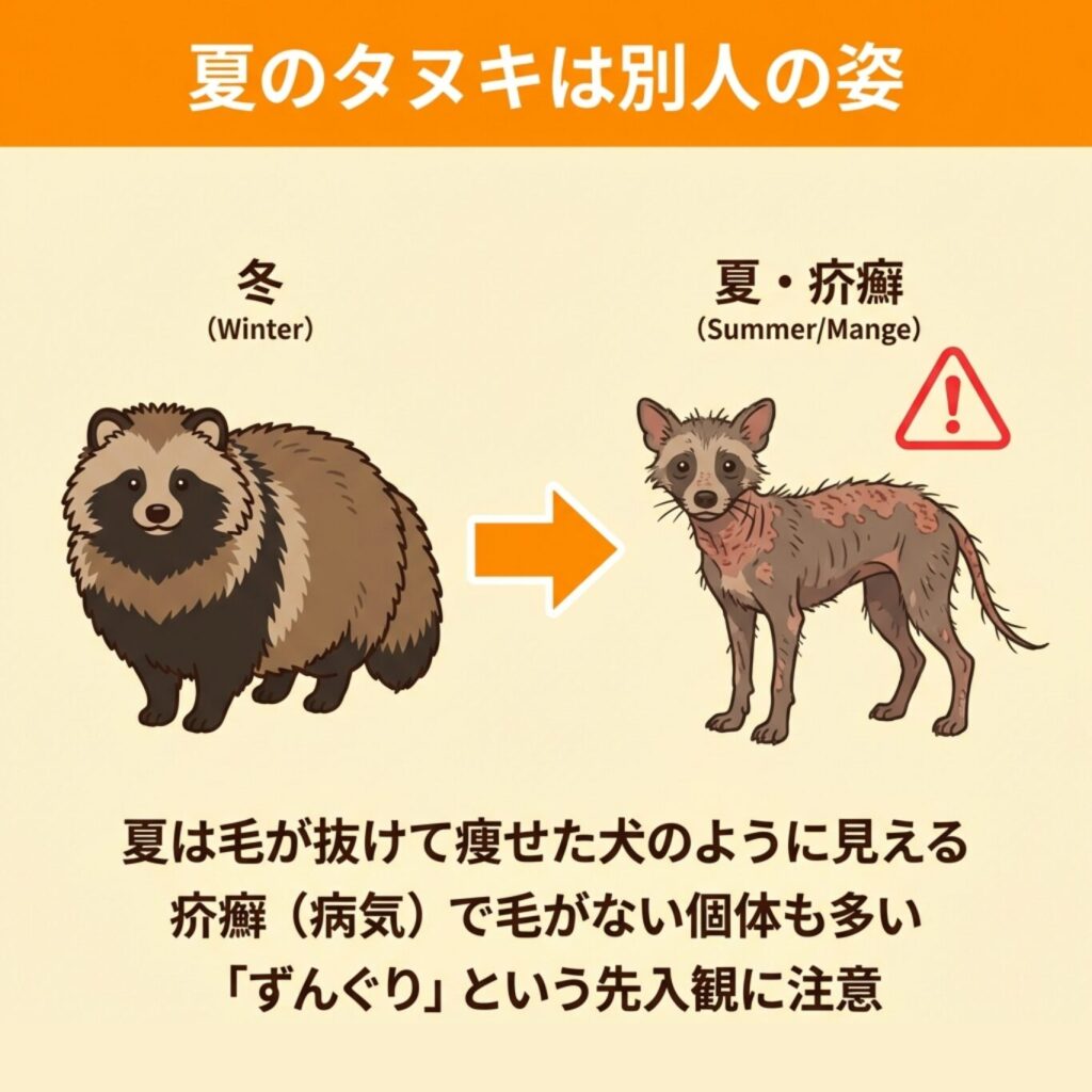 夏のタヌキは痩せて犬のように見えることがあるため、体型だけで判断しないよう注意が必要です。