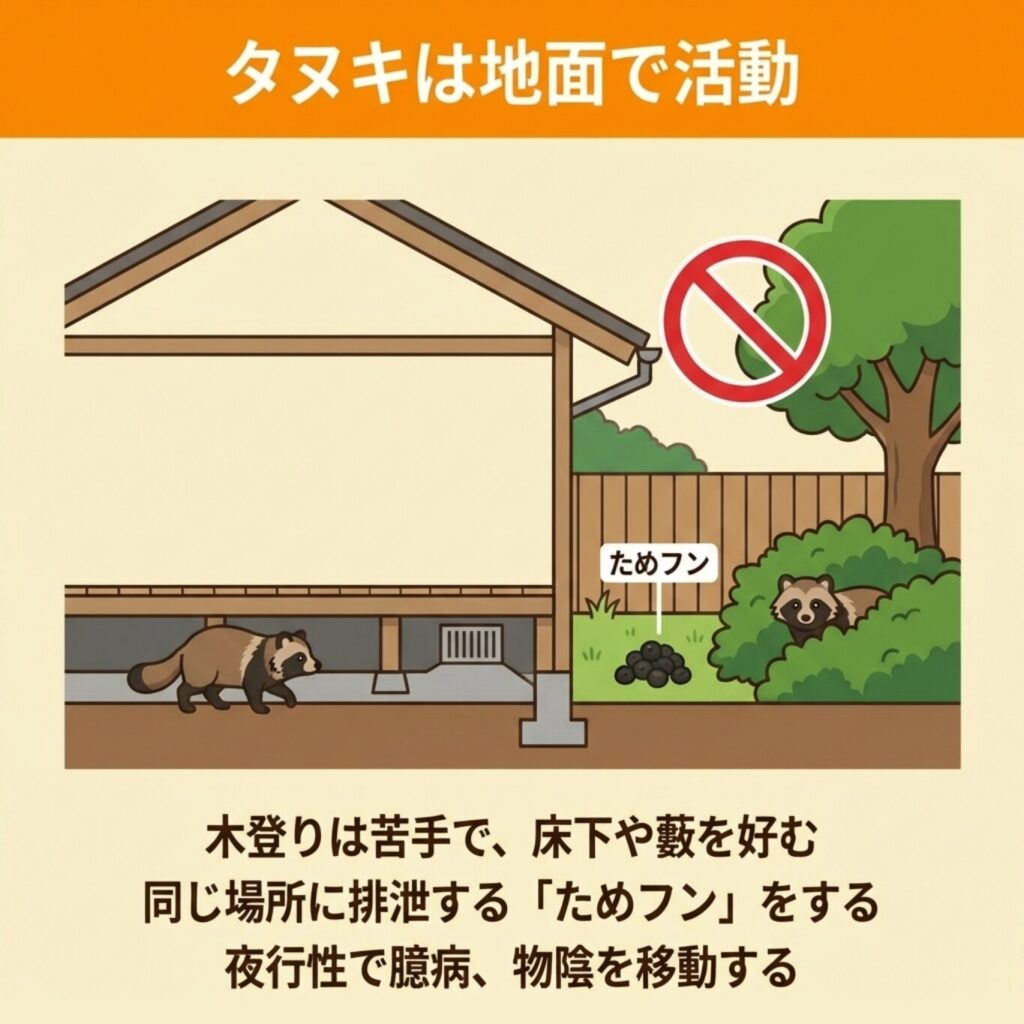 一方、タヌキは木登りが苦手なため、屋根裏に住み着くケースは比較的まれです。
