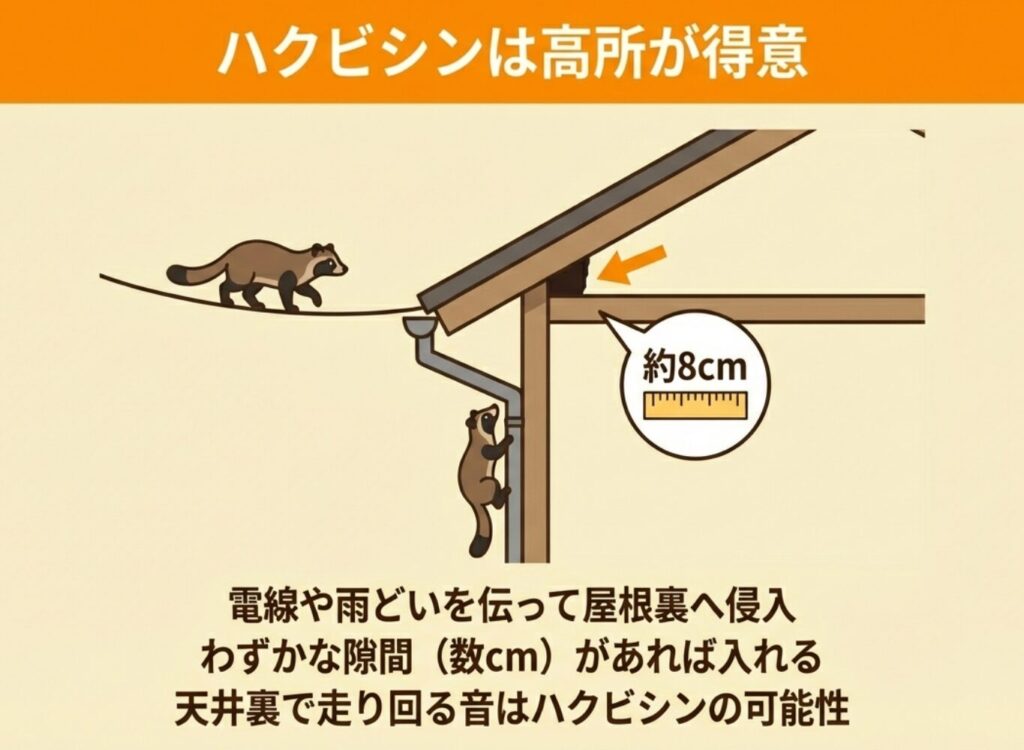 ハクビシンは木登りが得意で、雨どいや電線を伝って屋根裏に侵入することが多いためです。