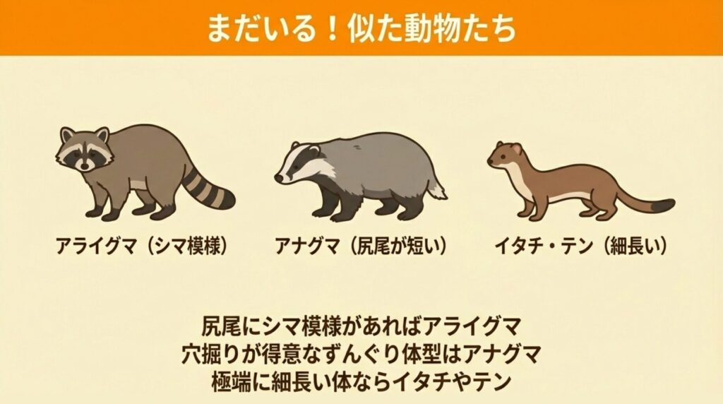 ただし、アライグマやイタチなど他の動物の可能性もあるため、足跡やフンの特徴も合わせて確認することをおすすめします。