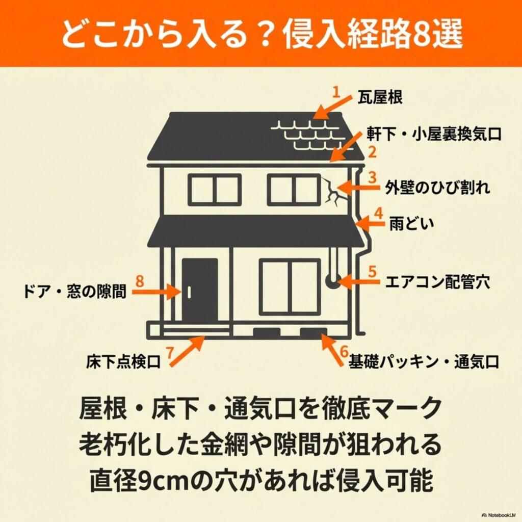 最も多く利用される侵入経路は換気口・通風口からの侵入で、全体の約40%を占めています。