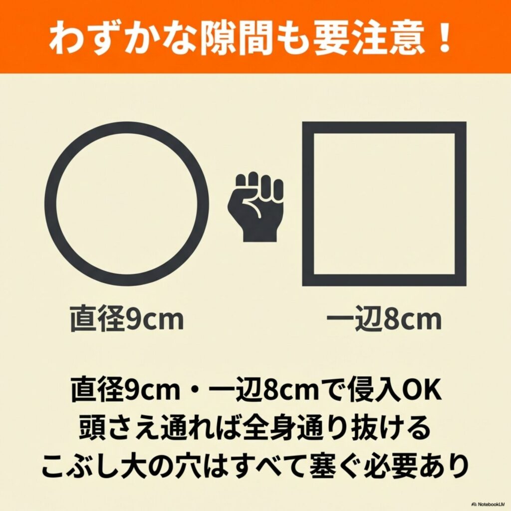 これは人間の拳くらいの大きさに相当し、思っているよりずっと小さな隙間で侵入を許してしまうのです。