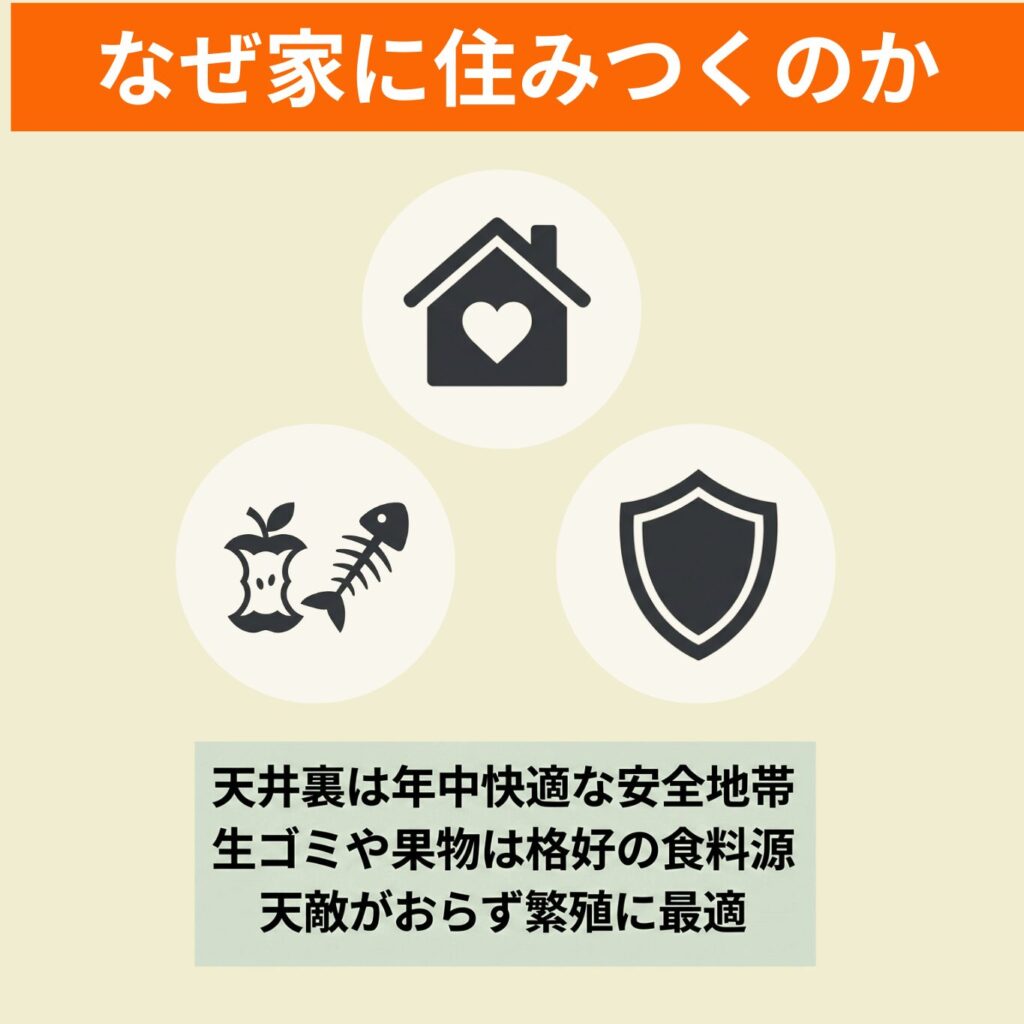 特に子育て期間中は安全な場所を求めるため、屋根裏は繁殖場所として魅力的に映るのです。