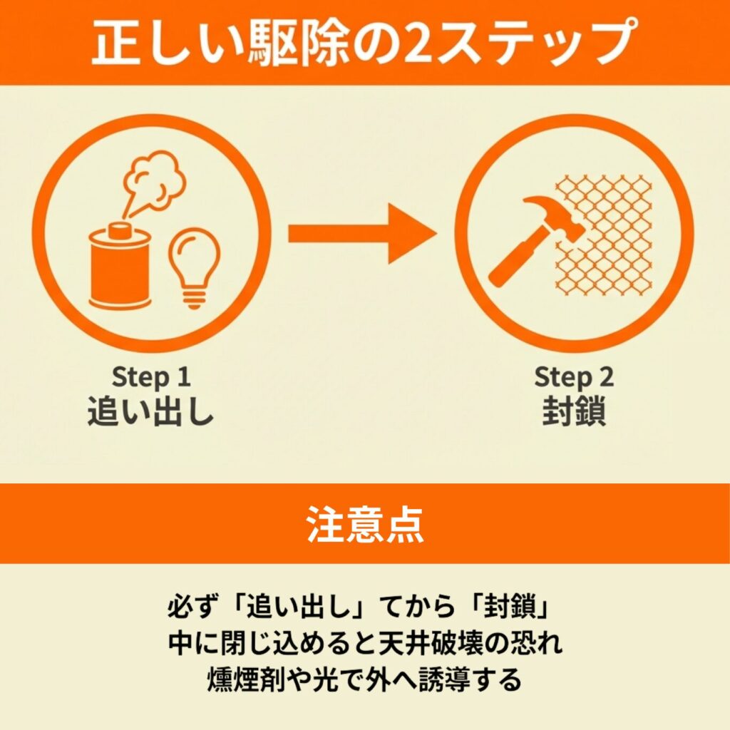 効果的な対策としては、まずハクビシンを確実に追い出してから侵入経路を塞ぎ、周辺環境の整備で再侵入を防ぐことが大切です。