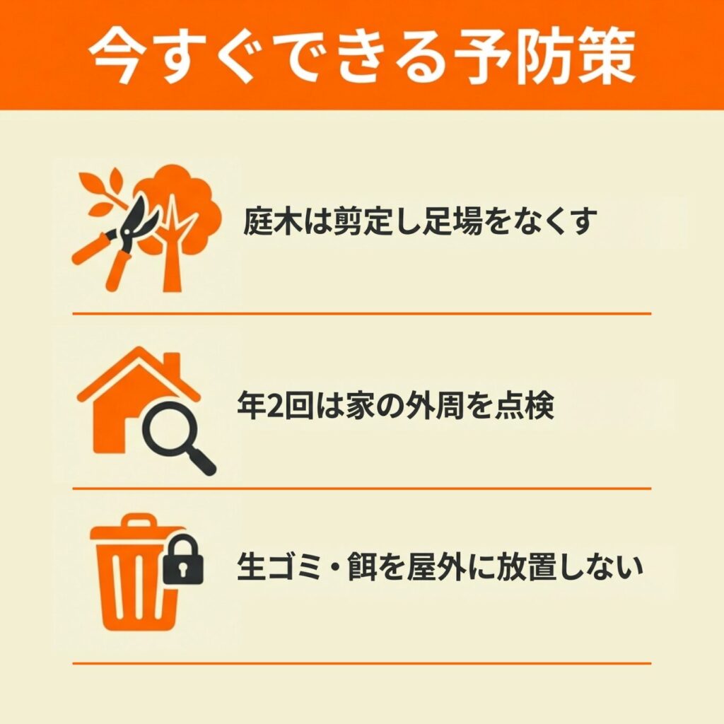 単に追い出すだけでなく、侵入する動機を断つことが根本的な解決につながります。