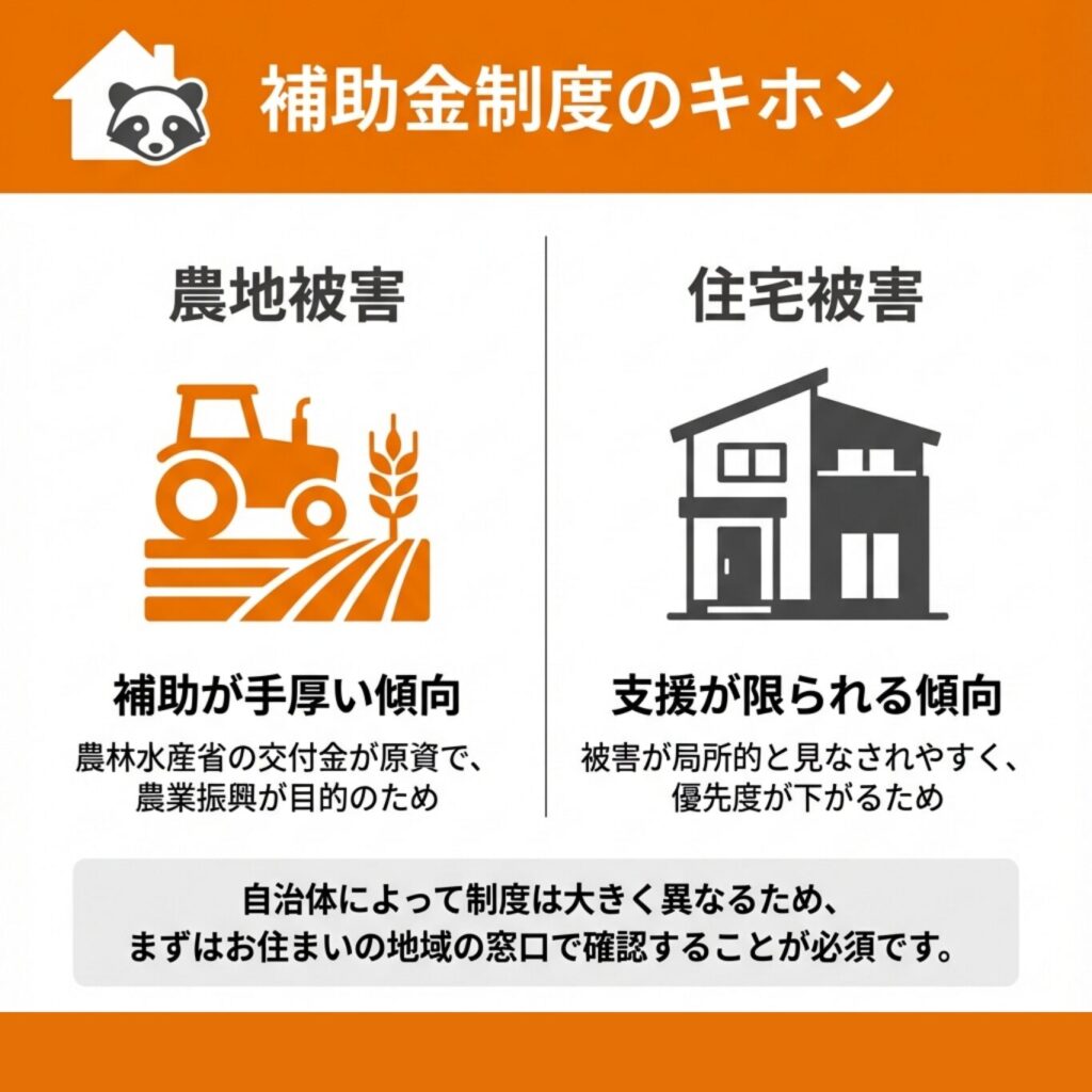 現在の補助金制度では、一般住宅よりも農地の被害対策が優先される傾向があります。