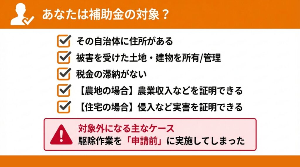 農業被害を重視する自治体では個人住宅は対象外とし、農業従事者に限定している制度も少なくありません。