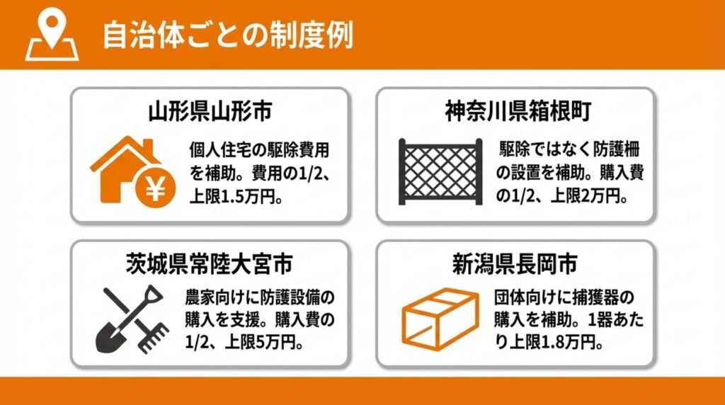 ハクビシン駆除の補助金制度は全国各地で実施されていますが、自治体によって対象者、補助額、申請条件が大きく異なります。