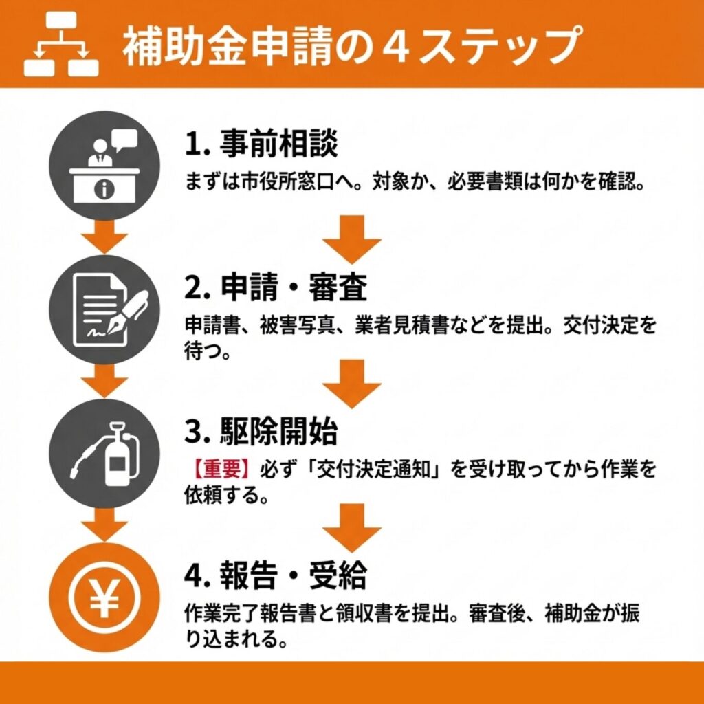 申請前に駆除を済ませてしまうと補助対象外になるので、必ず事前に相談しましょう。