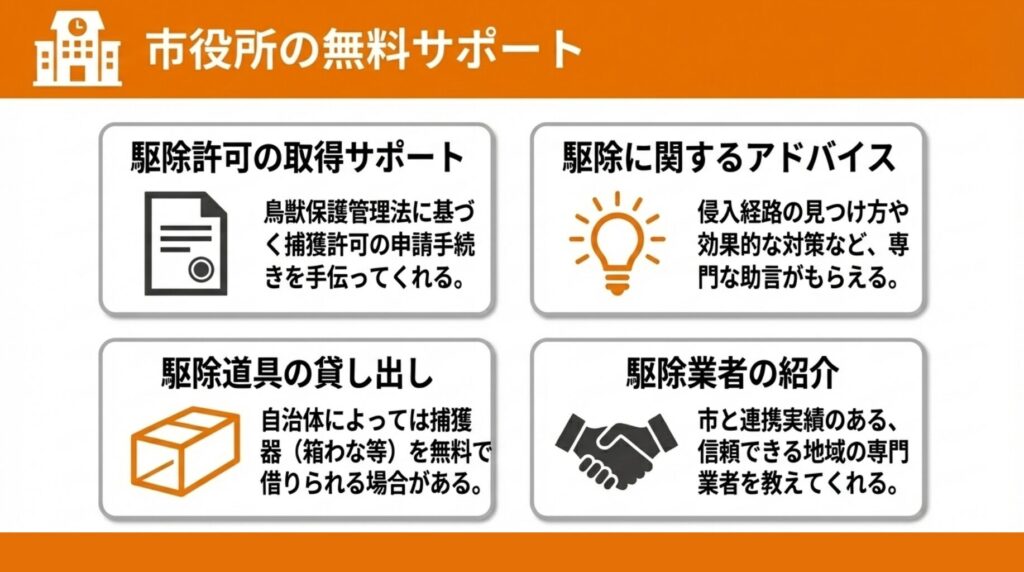 市役所の役割は、駆除許可の取得支援、アドバイス、捕獲器の貸し出し、業者の紹介などのサポートです。