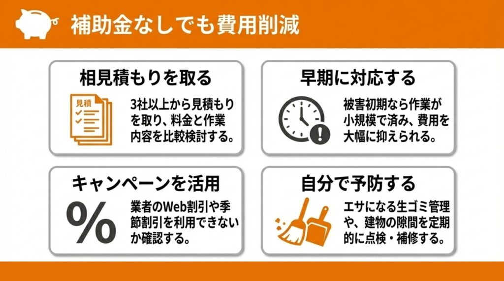 補助金の有無にかかわらず、複数業者からの見積もり取得や早期対応により、費用を抑えることも可能です。