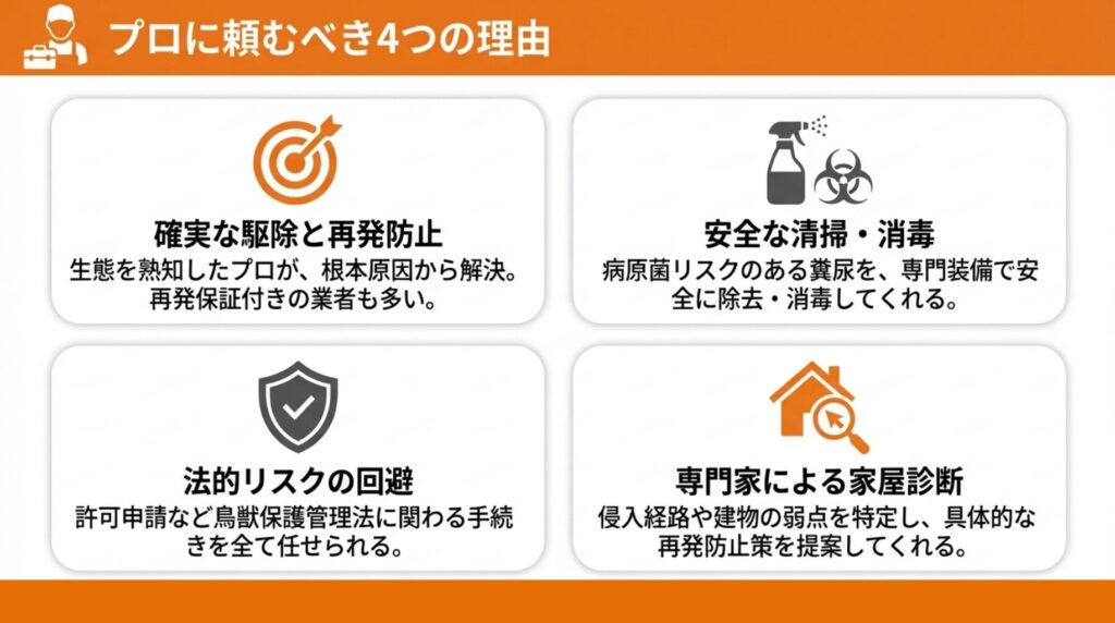 専門業者は必要な許可や免許を持っており、法令に沿った適切な駆除で依頼者の法的リスクを回避できます。