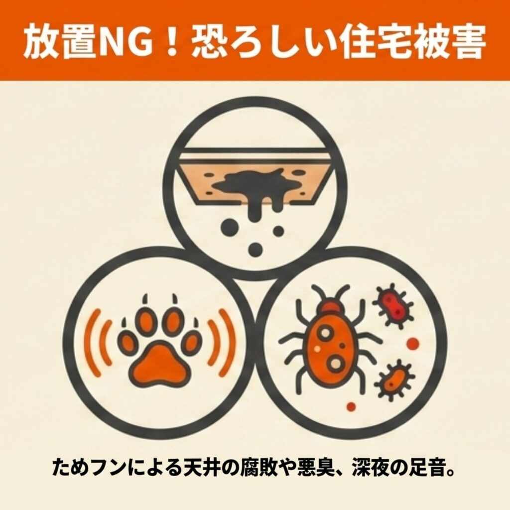 一度棲みつかれると、建物の構造的な劣化、悪臭や騒音による生活の質の低下、さらには健康被害と、影響は多岐にわたります。