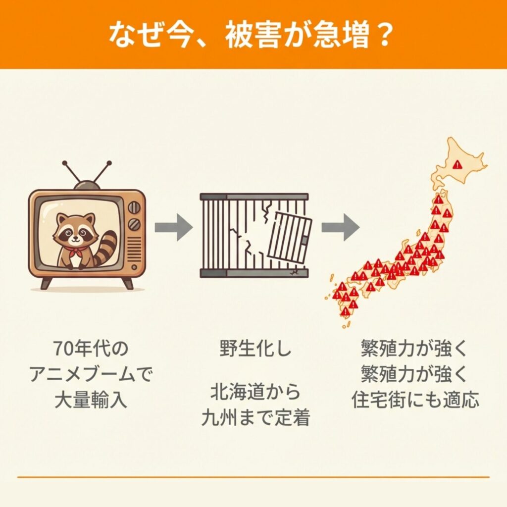 1970年代のペットブームで輸入された個体が逃げ出したり捨てられたりして野生化し、高い繁殖力で急速に数を増やしました。