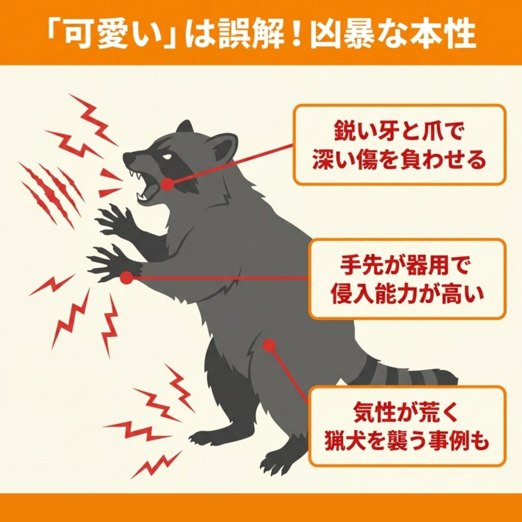 アライグマは非常に気性が荒く、攻撃性の高い動物です。