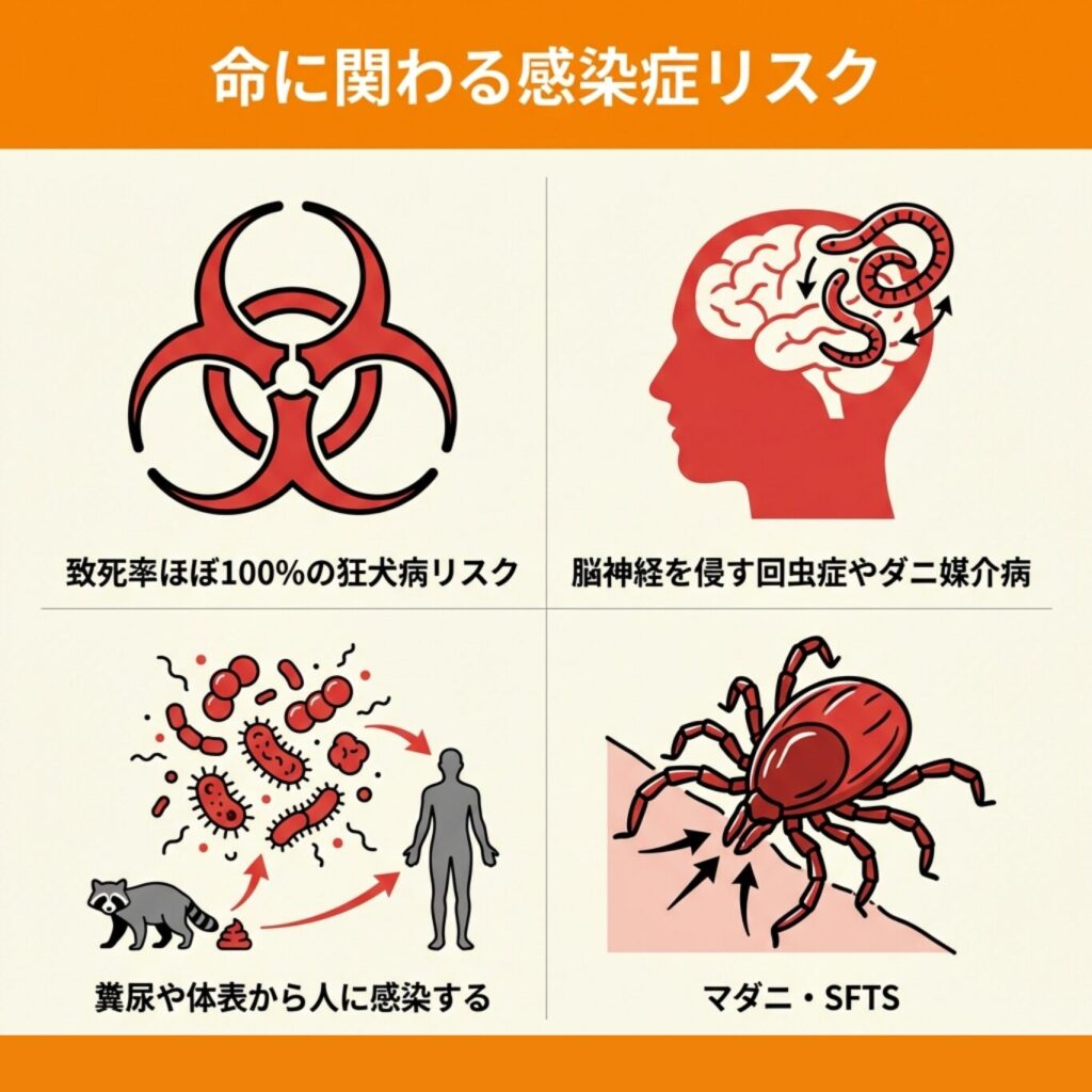 アライグマの最も深刻な危険性は、複数の人獣共通感染症を媒介する可能性がある点です。