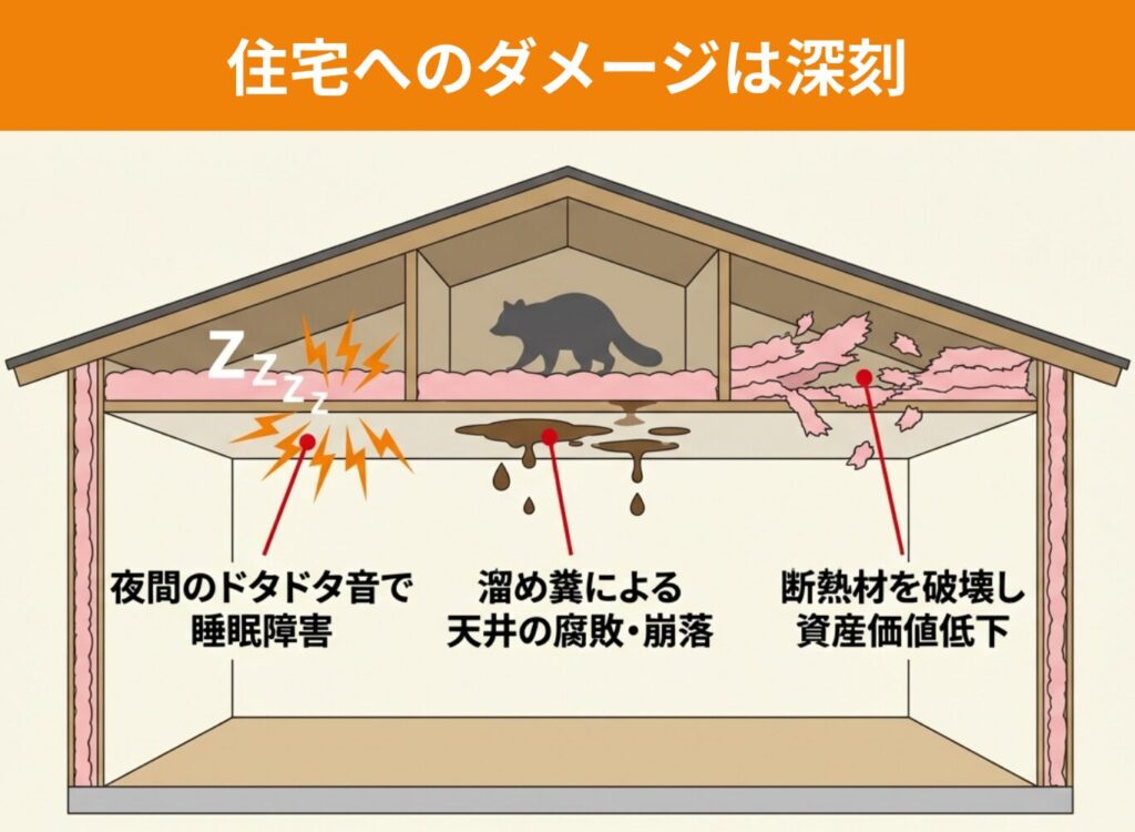 住宅への侵入被害も深刻で、屋根裏での営巣や糞尿による家屋の損傷、夜間の騒音など多岐にわたります。