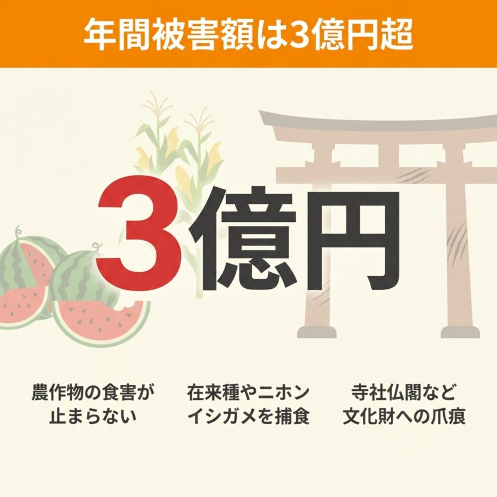 アライグマによる農業被害は年間3億円を超える規模に達しています。