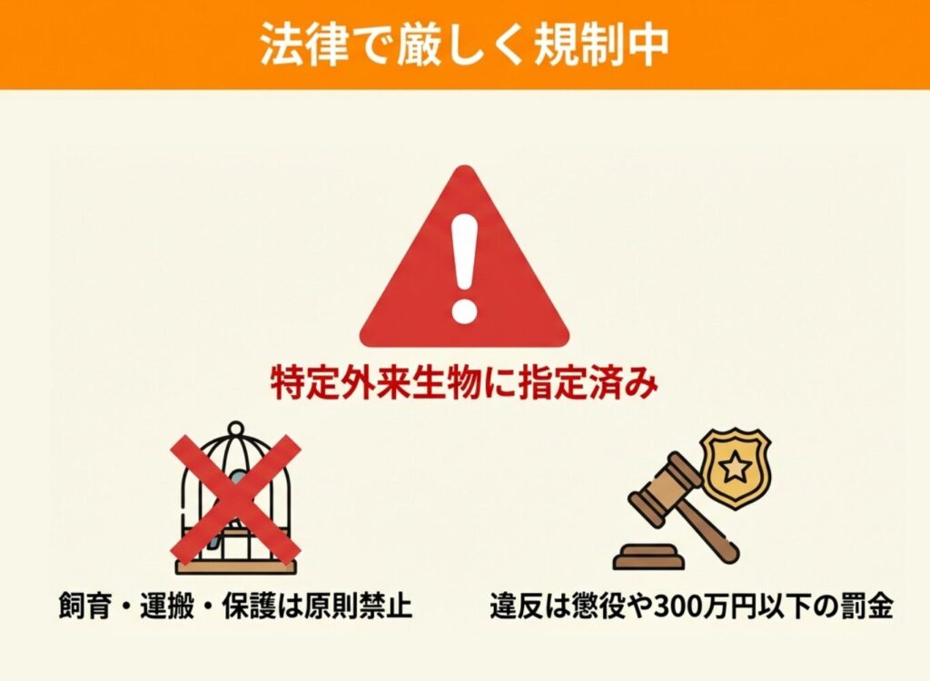 保護は特定外来生物法により禁止されており、違反すると罰則が科されます。
