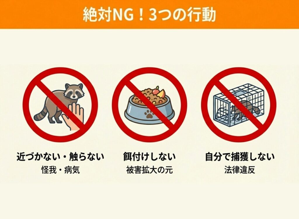 餌付けや保護は、アライグマを発見した際に最もしてはいけない行為です。