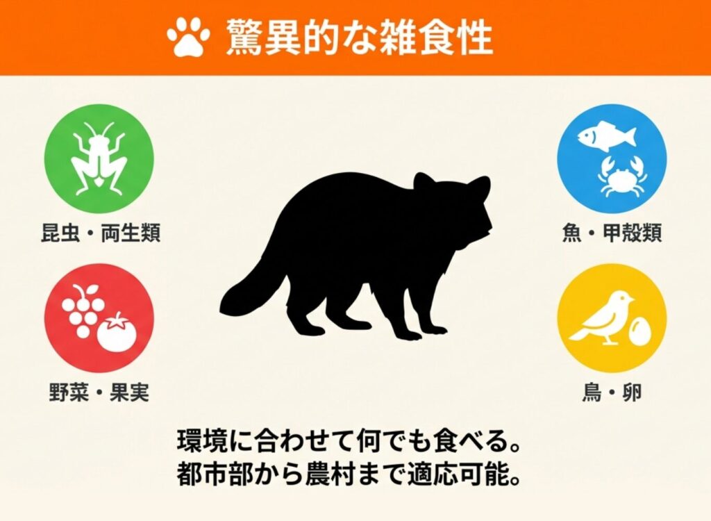 国立環境研究所の侵入生物データベースによると、アライグマは「小哺乳類・魚類・鳥類・両生類・爬虫類・昆虫類・野菜・果実・穀類等を食べる」と記載されており、その食性の広さがうかがえます。