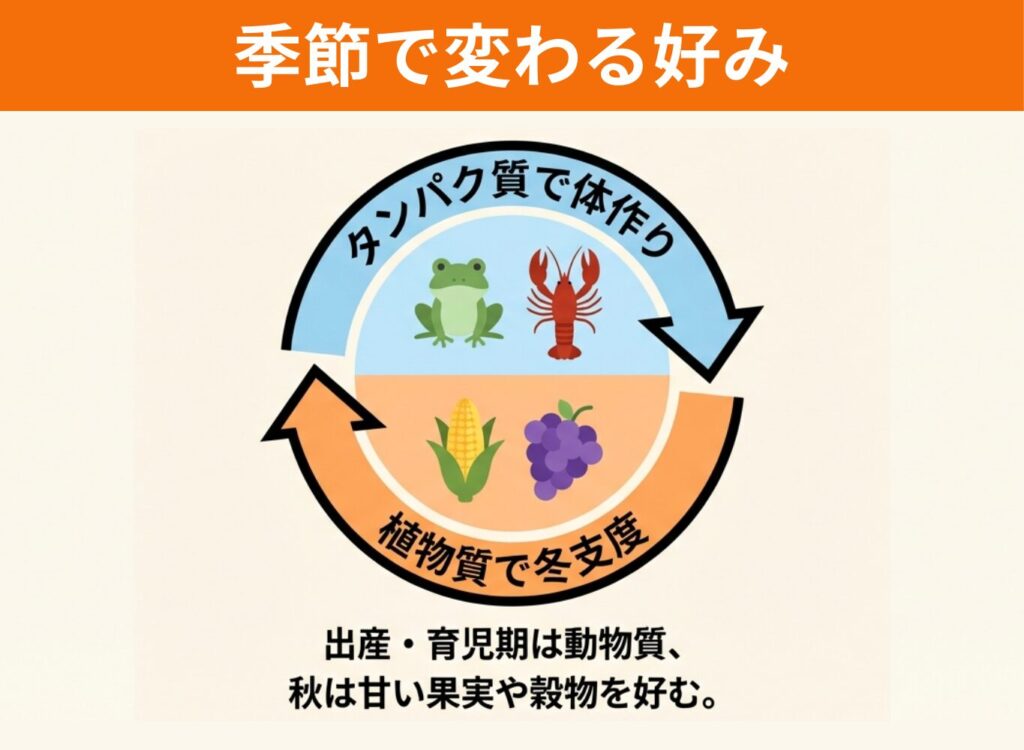 春から夏にかけては、昆虫やカエル、ザリガニなどのタンパク質が豊富なエサを多く食べて体力をつけ、秋になると果実や穀物などエネルギー源となる植物質を中心に摂取します。