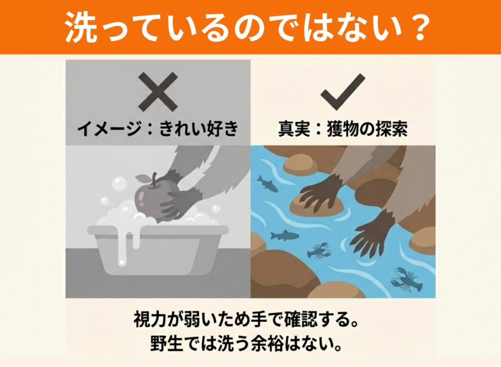 多少汚れていてもそのまま食べてしまうことが一般的であり、「食べ物を洗う動物」というイメージは必ずしも正確ではないのです。