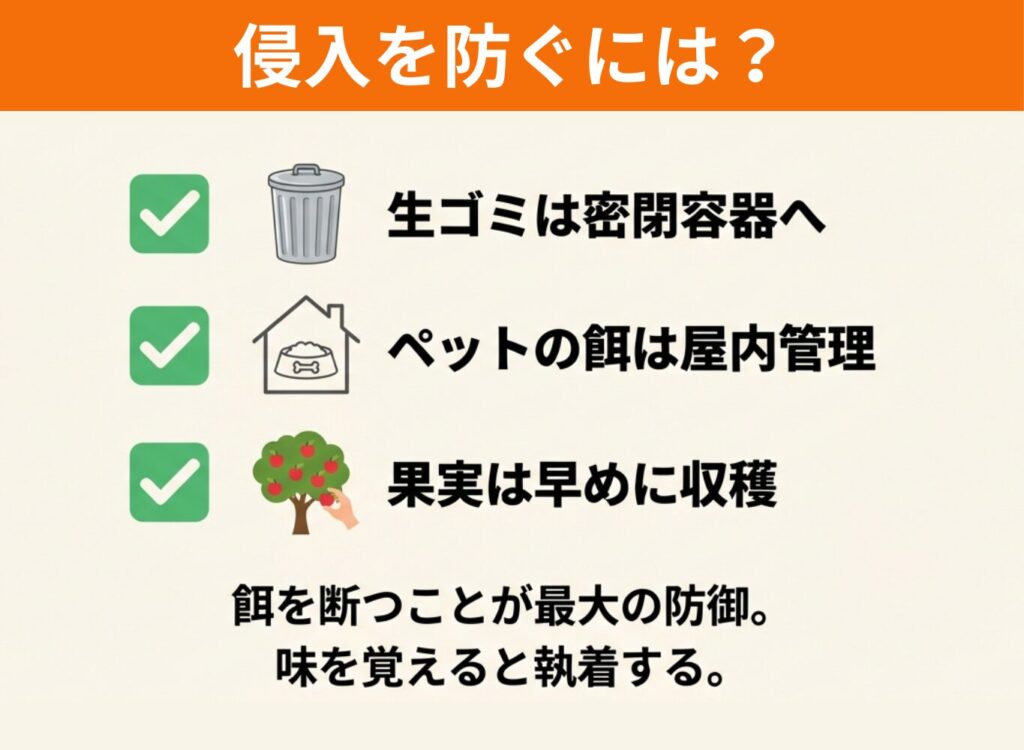 たとえば、庭の果樹やゴミ置き場で食べ物を手に入れた経験があると、毎晩のように現れてエサを探すようになります。