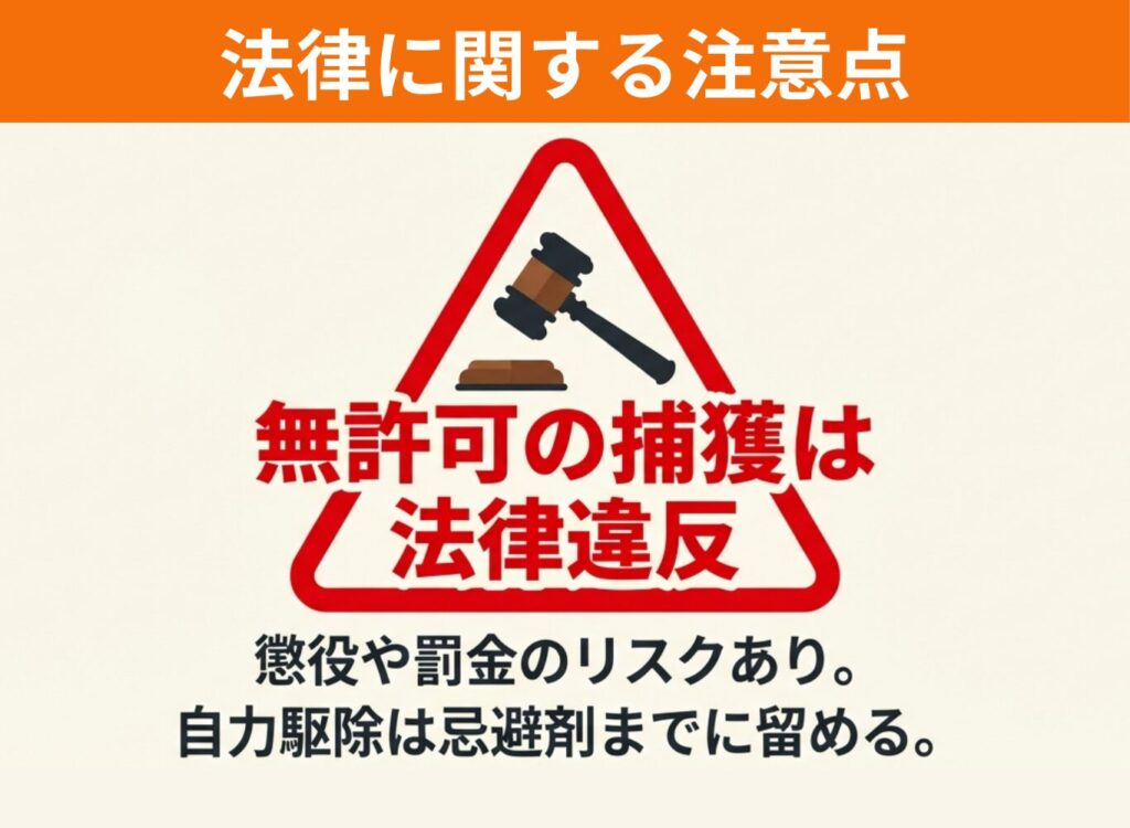 たとえ自宅の敷地内であっても、勝手に罠を仕掛けたり捕まえたりすると罰則の対象となる可能性があるのです。