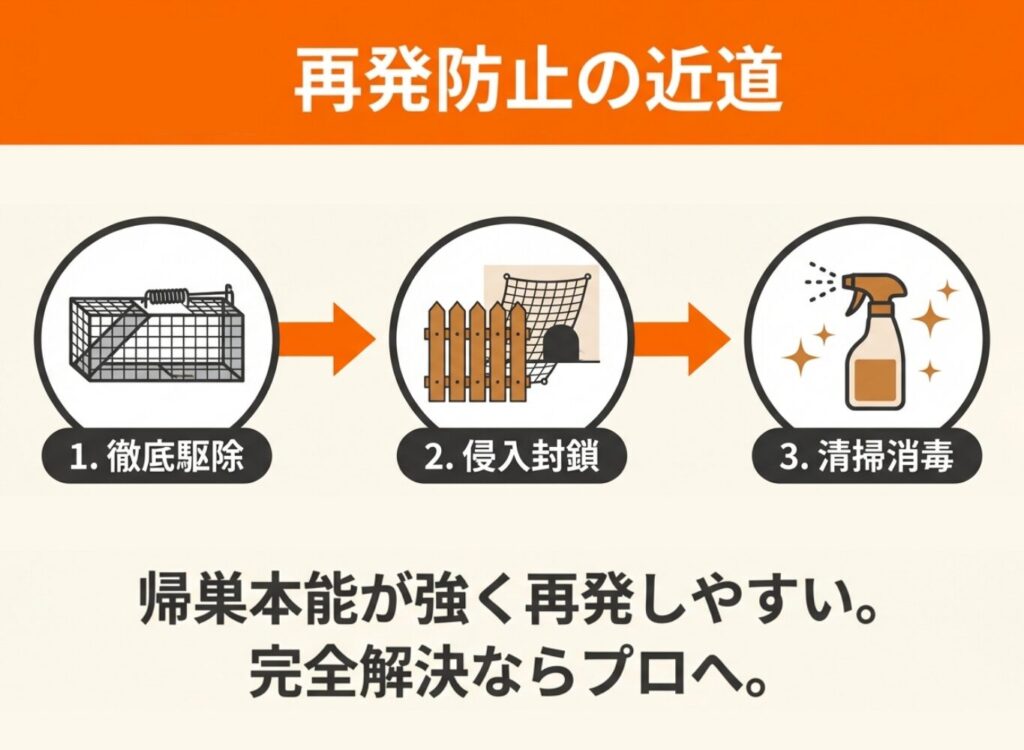 根本的な解決を図るためには、専門業者による駆除と再発防止対策を検討することをおすすめします。