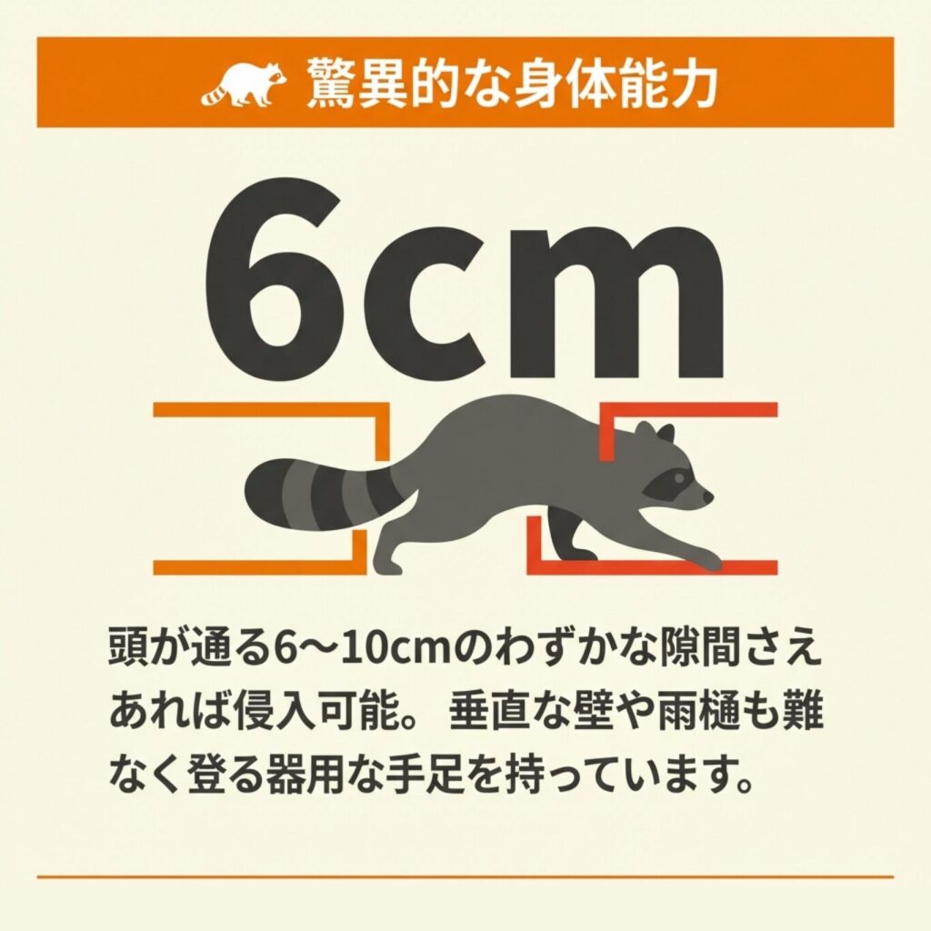 アライグマは柔軟な体と器用な手足を持ち、わずか6〜10cmの隙間からでも家屋に侵入できる動物です。