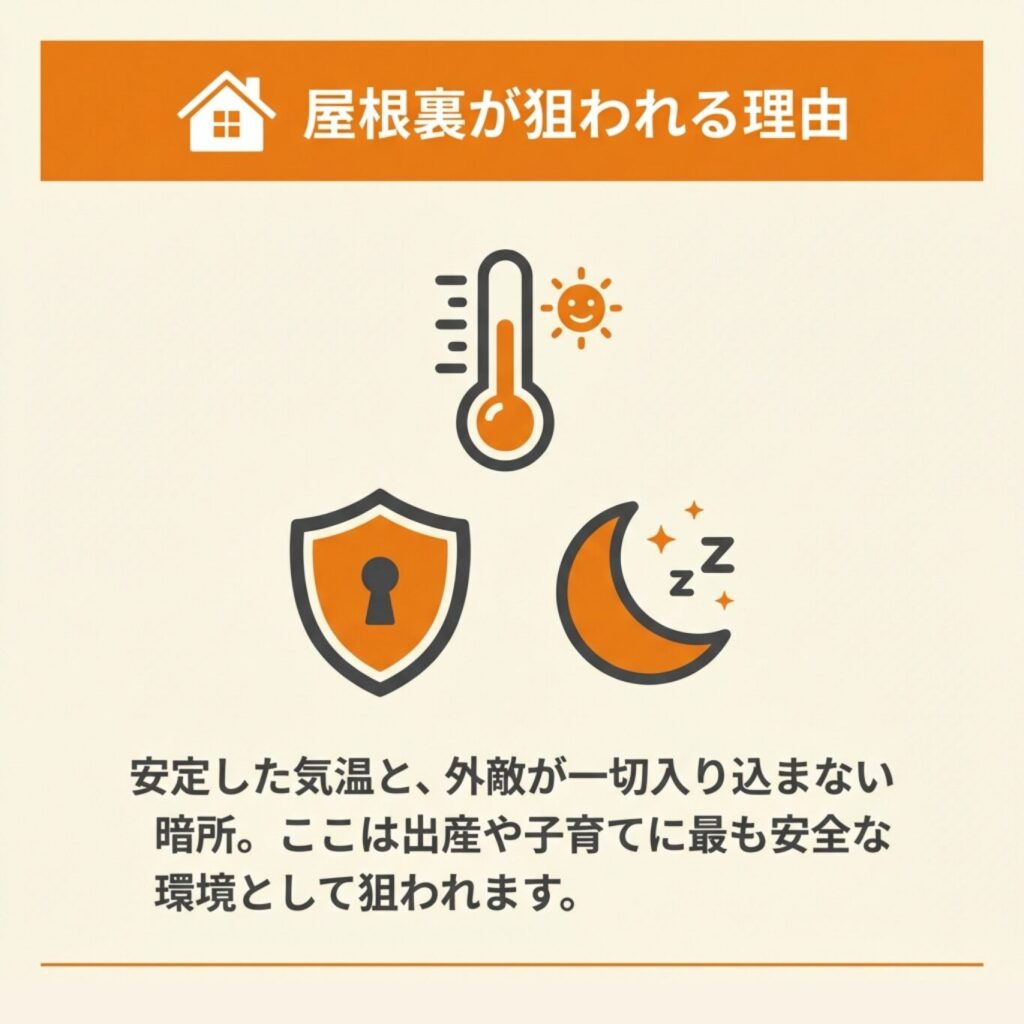 とくにメスは出産や子育ての時期に安全な場所を求める傾向が強く、屋根裏は理想的な繁殖場所となりやすいのです。