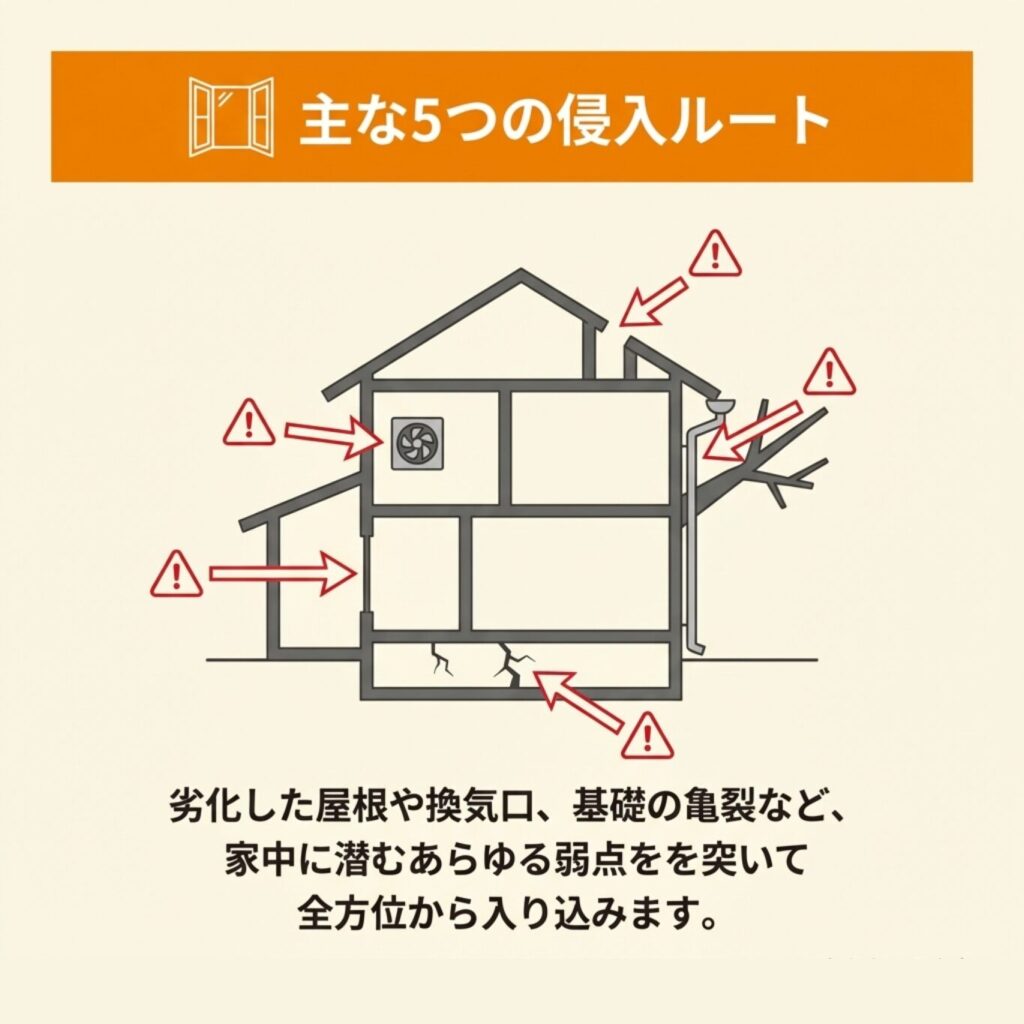 屋根や軒天の破損、換気口のカバーの劣化、外壁の亀裂など、住宅のさまざまな弱点が侵入経路となり得ます。