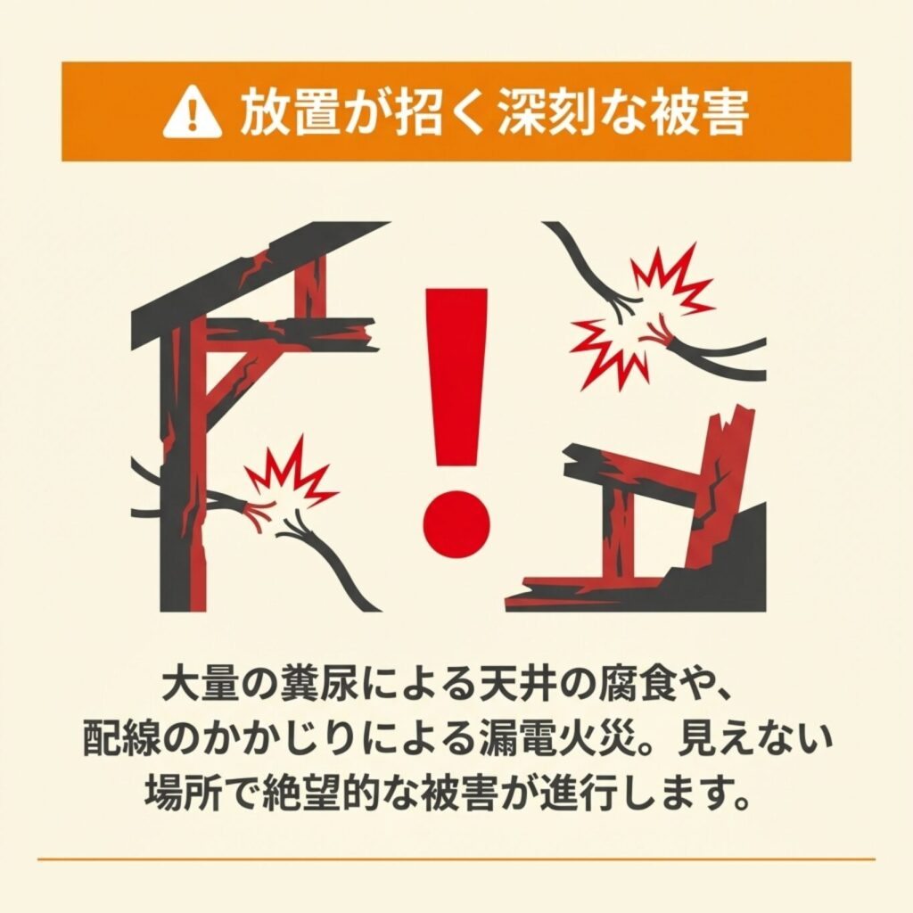 屋根裏に棲みつかれると、糞尿による悪臭や天井の腐食、配線をかじることによる火災リスク、ダニやノミを媒介とした感染症の危険など、深刻な被害が発生します。
