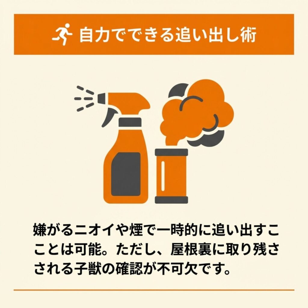 自分で追い出しを試みる場合は、忌避剤やくん煙剤の使用が有効ですが、侵入経路の封鎖まで行わなければ再侵入を許してしまいます。
