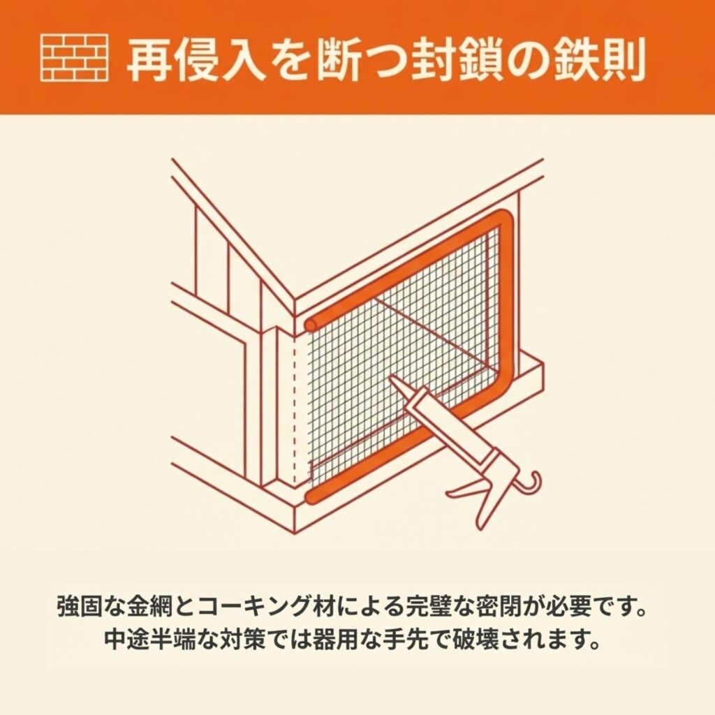 再侵入を防ぐためには、追い出しと同時に侵入経路を完全に封鎖することが不可欠です。