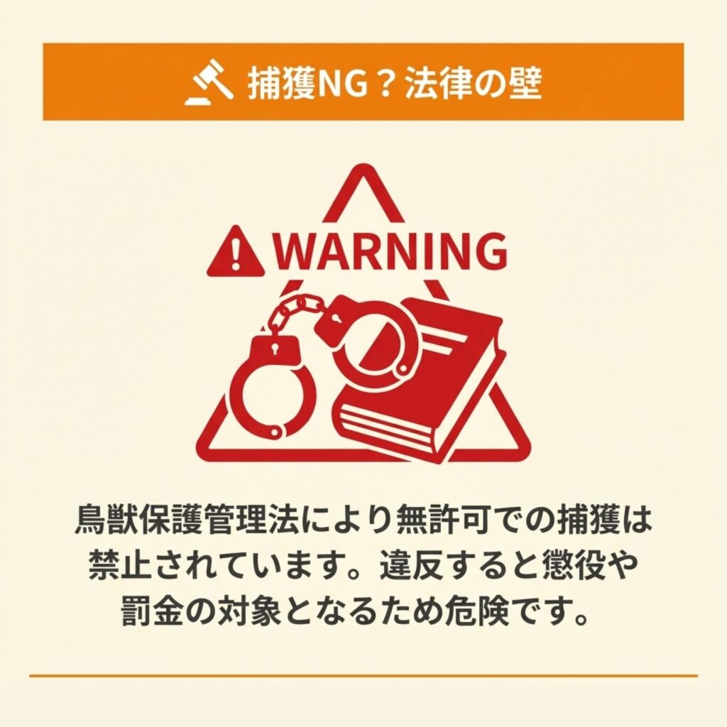 また、アライグマは鳥獣保護管理法と外来生物法で規制されているため、無許可での捕獲や移動は法律違反となります
