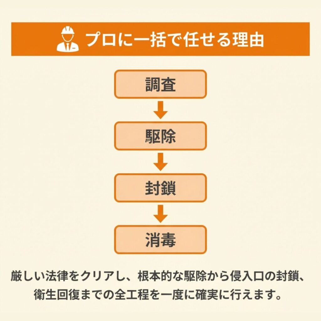 専門業者に依頼する最大のメリットは、調査から駆除、侵入経路の封鎖、消毒までを一括して任せられる点です。
