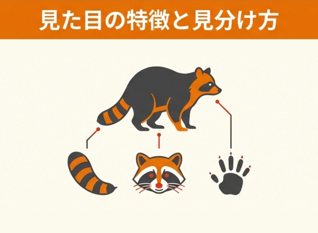 アライグマにはいくつかの分かりやすい外見的特徴があり、しっぽの模様や顔まわりの配色、足跡の形状を確認すればタヌキやハクビシンとの見分けがつきやすくなります。