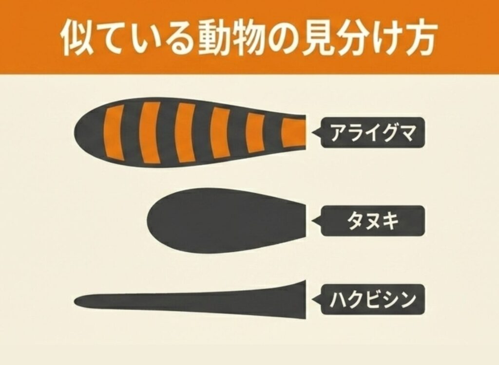 暗い場所ではしっぽの縞が見えにくいこともあるため、足跡や糞などの痕跡とあわせて総合的に判断するのが確実です。