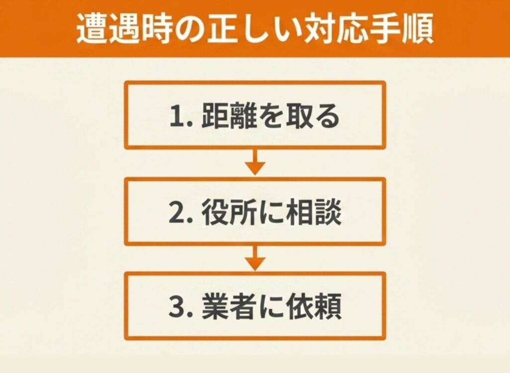 正しい知識に基づいて冷静に対応すれば、被害を最小限に抑えられます。状況別の対応手順を順に説明します。