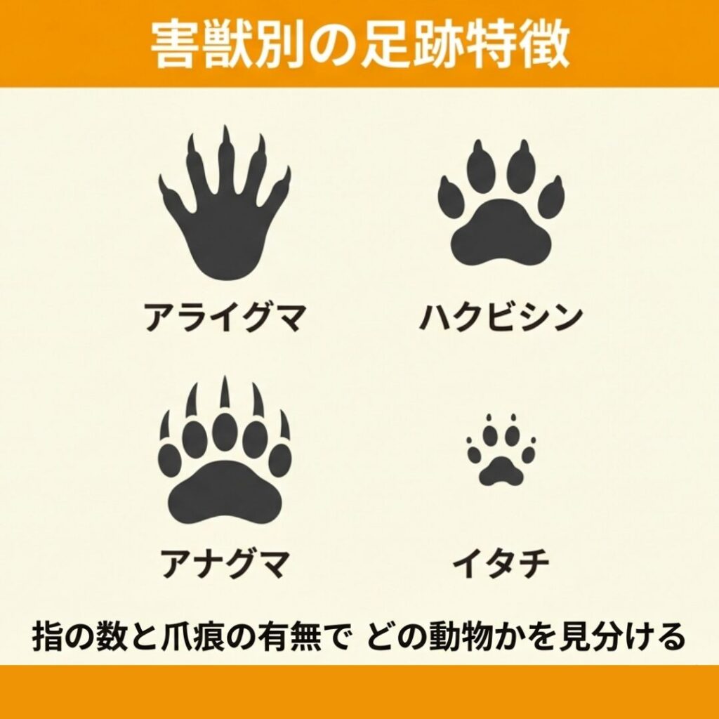 タヌキやハクビシンなど類似動物との判別には、指の本数、爪痕の明瞭さ、足跡のサイズと形状を総合的に確認することが重要となります。