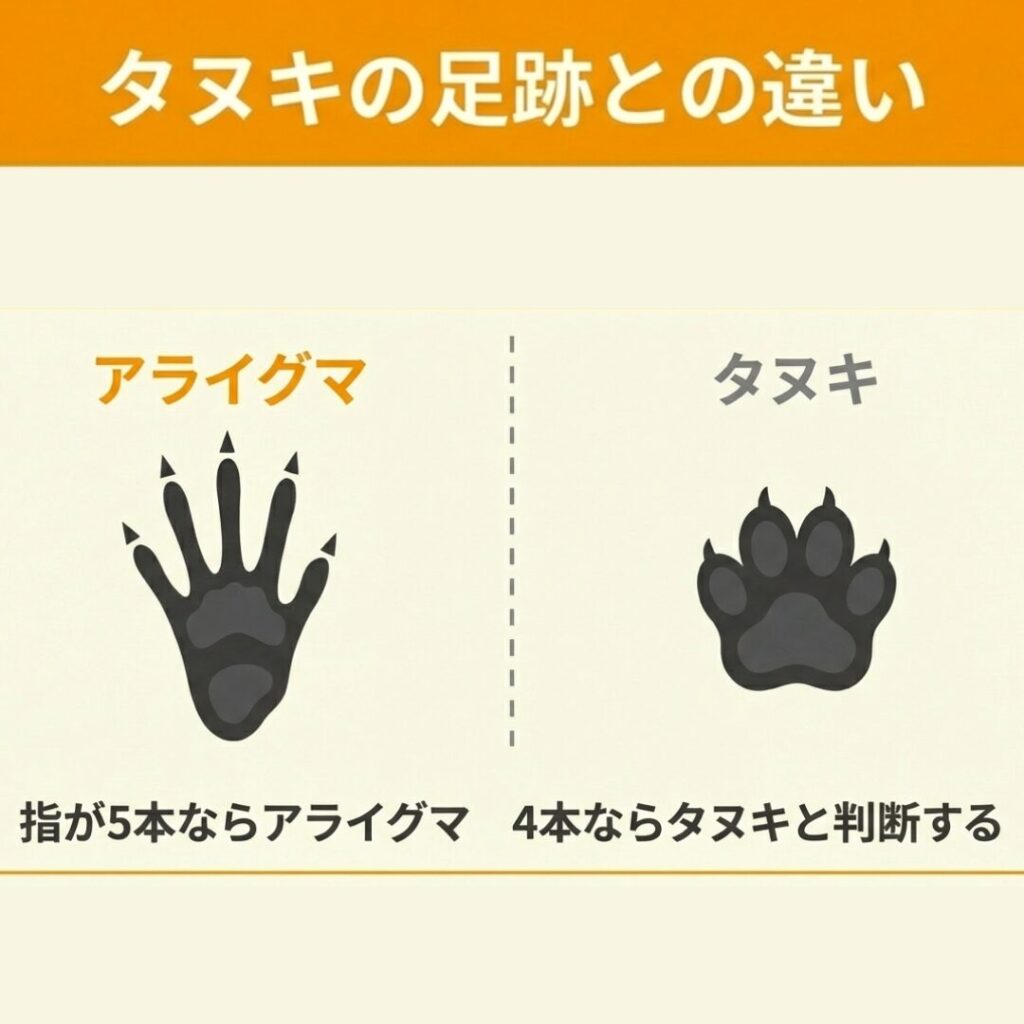 アライグマは5本指の足跡を残すのに対し、タヌキは4本指であるため、これだけで確実に判別できます。